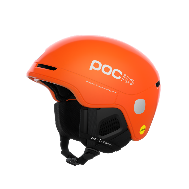 POCito Obex Mips barnahjálmurfyrir skíði og snjóbretti. Hjálmurinn er mjög léttur og tilvalinn fyrir yngstu iðkendurna (frá 3 ára). Hjálmurinn er í mjög sýnilegum flúrljómandi litum og með endurskinsmerkjum til að hámarka sýnileika í brekkunum. RECCO® endurskinsmerki. tr. Föst gleraugnaklemma, Mips snúningshöggvörn, loftun fyrir gleraugu og stærðarstillingarkerfi sem tryggir að hann vex með barninu.